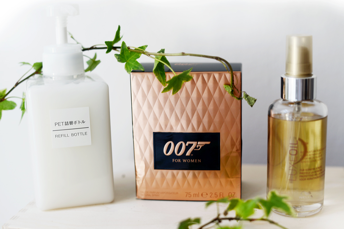 Såhär ser det ut på min badrumshylla just nu. En superfin tvål som Sirran köpt på Muji, Lux Oil från Wella som gör underverk för mitt nyblekta/skadade hår och så parfymen 007 FOR WOMEN. Jag har aldrig varit en parfym-tjej, men den här luktar så himla gott?! Det är någon blandning av svarta vinbär, vanilj och lite lite cederträ. En ganska “mjuk” lukt, vilket passar mig då jag har stora problem med blommiga dofter som liksom sticker i näsan. Vem hade trott att jag skulle gå omkring och lukta Bond, haha.