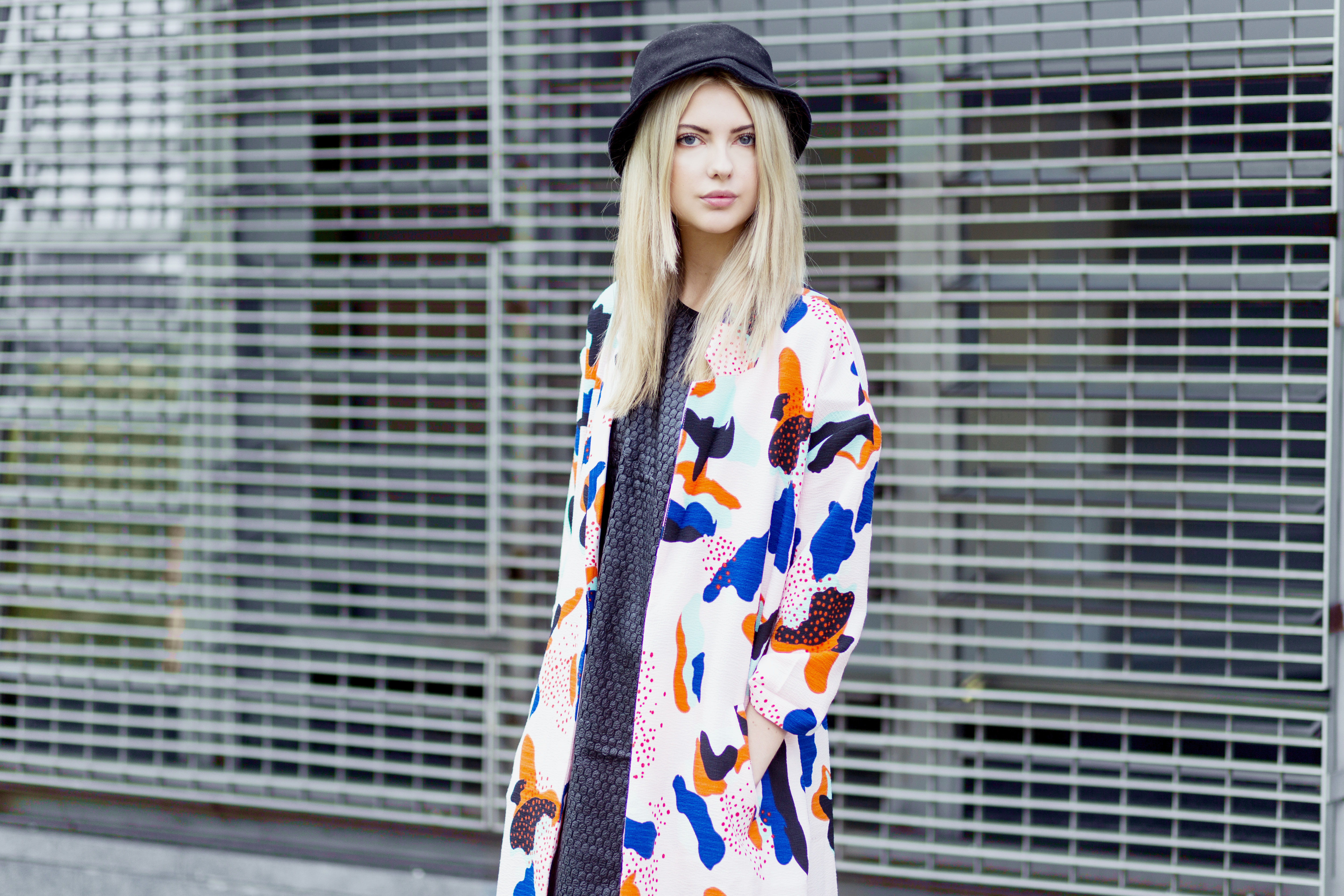 The whole outfit reminds me of fish. The dress is like fish scales, the Jacket like koi carps, the hat like a fisherman.